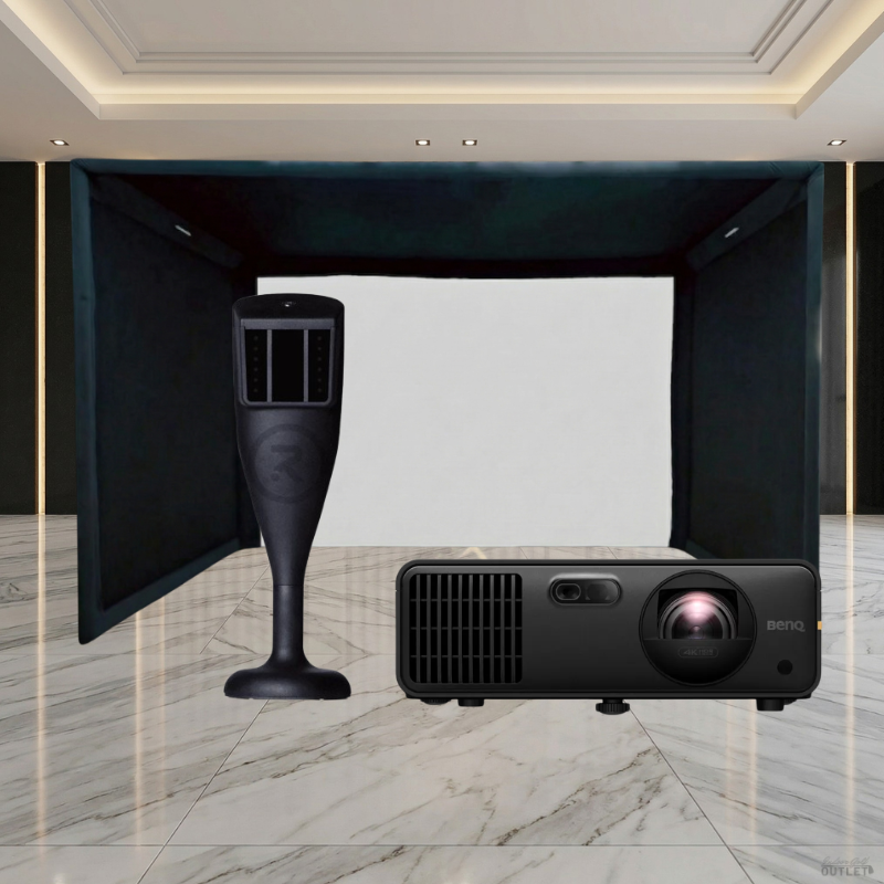 The Red Stakes Golf One Launch Monitor SIGPRO Commercial Golf Simulator Enclosure Projector Package includes the Red Stakes Golf One Launch Monitor, a SIGPRO Commercial Enclosure with your choice of Premium (White) or Premier (Gray) Impact Screen, and a projector selected to suit your space and performance needs.